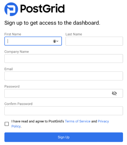 First, you must sign up or log in to PostGrid’s website. The sign-up process is simple and short. All you have to do is fill in some essential details to create a profile.