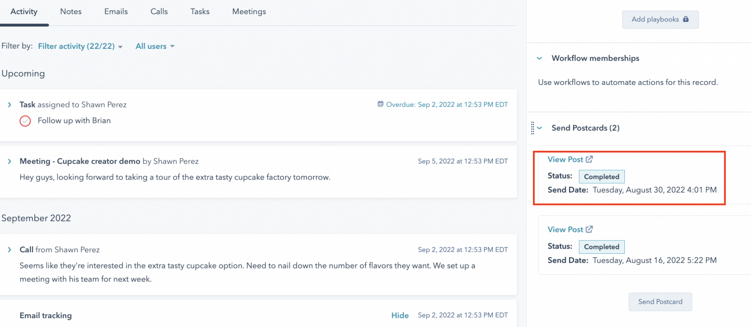 Send Letters, Postcards and Checks to contacts using CRM Popup card. Send bulk mails using workflow automation natively in HubSpot