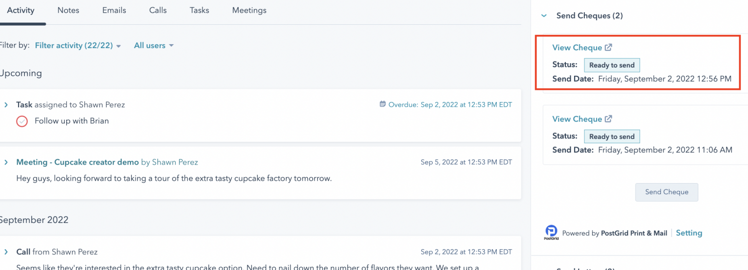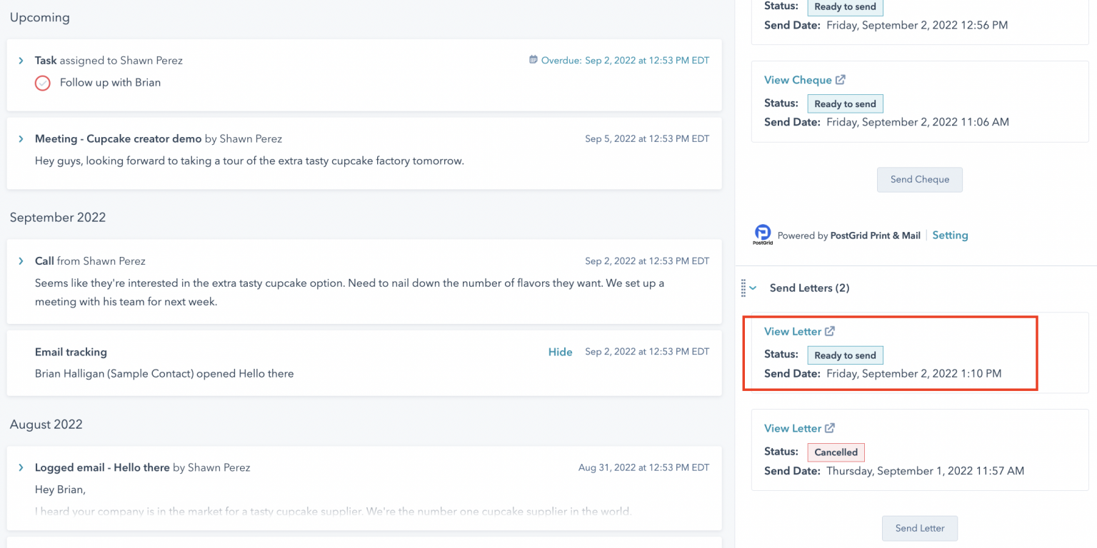 Send a single mail in the form of a letter, postcard or a check/cheque to a single contact in HubSpot
