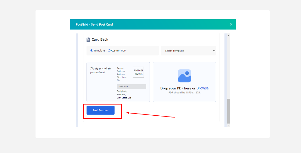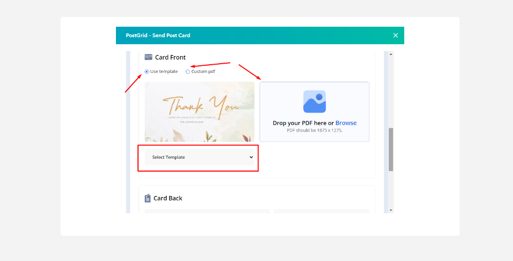 Choose Template or Upload PDF (Back Template): Choose Back Postcard Template from your template library from PostGrid or You can choose to upload PDF Template. If you choose to upload PDF Make sure they are following our design guidelines here.