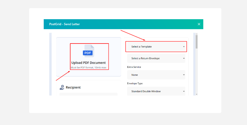 If you have a PDF Document you can Upload it or Select a Template (from your template list in PostGrid)