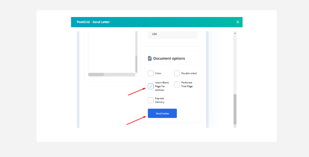 Document Options (Optional): You can add document options such as color, double sided, insert blank page for address, perforate first page, express delivery etc. For our demo purpose we will select insert blank page as this will insert a blank page where the recipient and sender details will be printed on a blank page to cover the double window envelope.