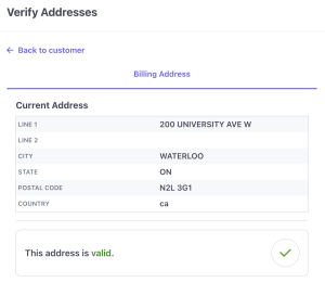 • Create a customer with an address of 200 University Ave W in Waterloo, Ontario, postal code N2L 3G1. After entering the information, click Add customer and the address auto-validation will run its validation.