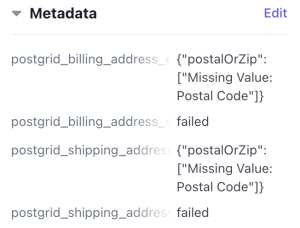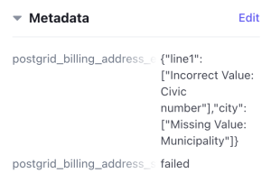 • Failed Addresses: Under Metadata, PostGrid will provide details on why the address failed to verify, split into billing and shipping address errors and status. The error is an object with a key-value pair describing what part of the address has an error and what the error is.