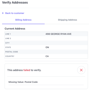 Clicking Verify Addresses will run PostGrid’s address verification feature on that customer. The address can either be verified, corrected, or fail to verify with the reason given.