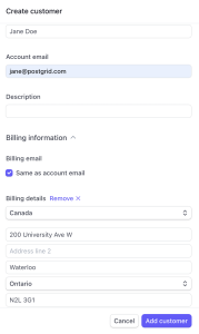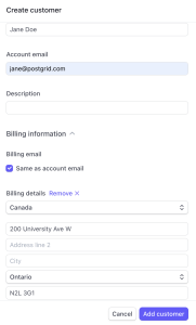 In this example, we have created a customer where the billing and shipping address has an incorrect postal code and missing city, this address should fail to verify and PostGrid will point out the missing city and incorrect postal code error.