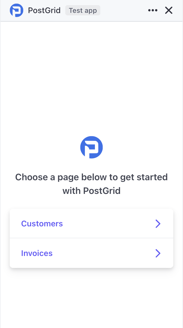 Upon clicking on PostGrid’s application, a pop-up main menu will appear as shown below. This menu offers two navigation options: Customers and Invoices
