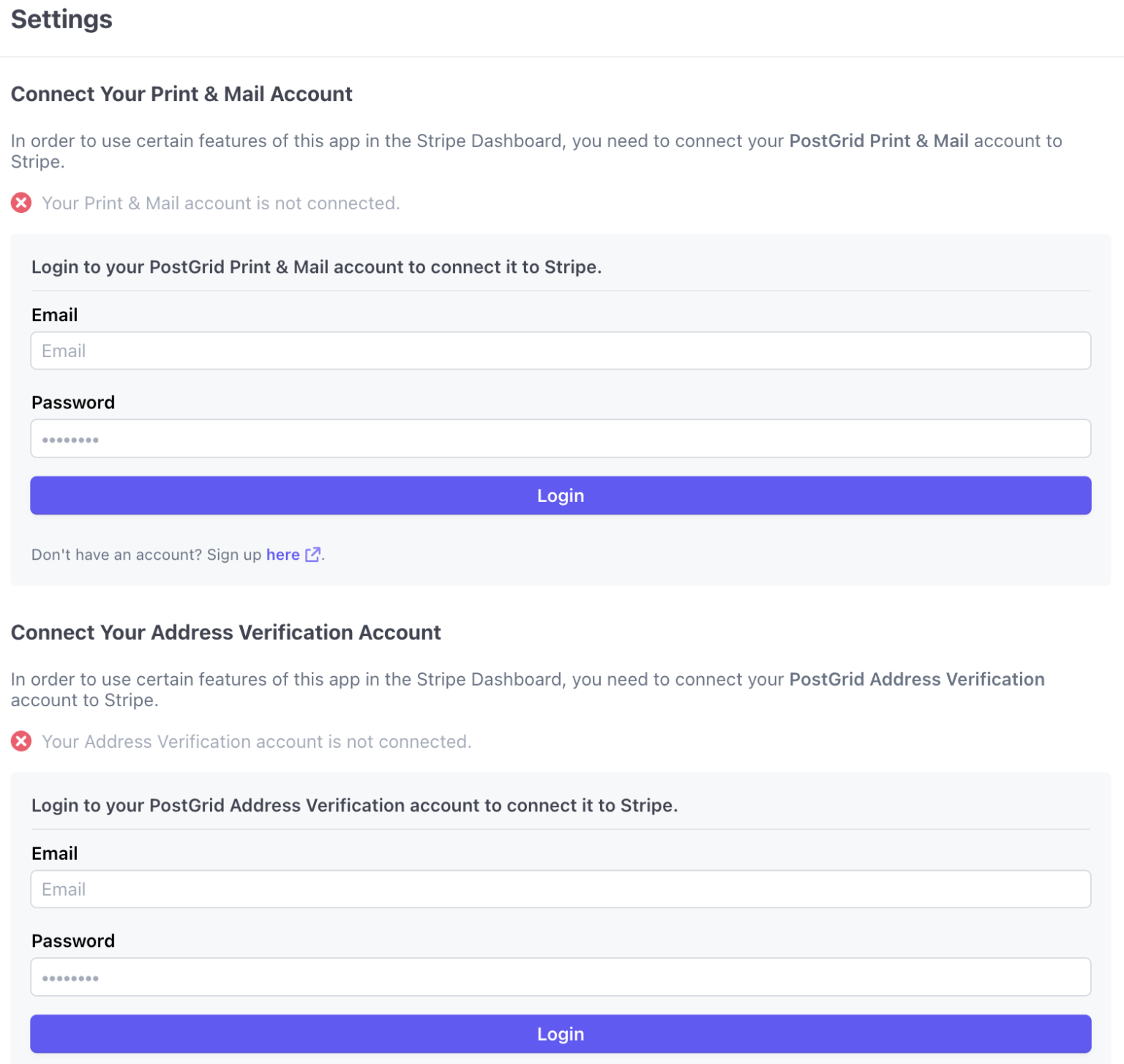 In the app settings menu, you will be prompted to login to both of your PostGrid accounts, the Print and Mail API account as well as the Address Verification API account. Logging in to your PostGrid account will connect your PostGrid account to the PostGrid application on stripe, giving you access to both the Customer Address Verification feature and the Invoice Mailing feature.