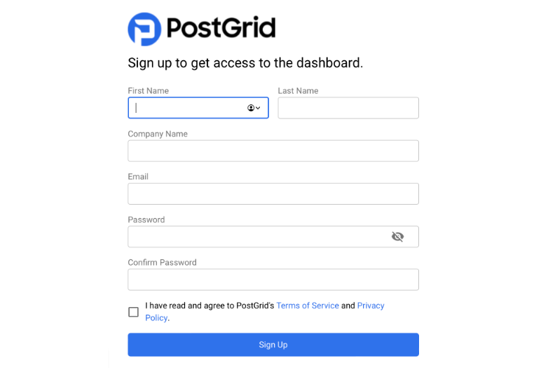 The first step to bulk mail postcards for your business is to sign up or sign in to your account on PostGrid (or any other mail service provider). In the case of PostGrid, the signup process is short and straightforward. You only have to fill up some essential details to create a profile.