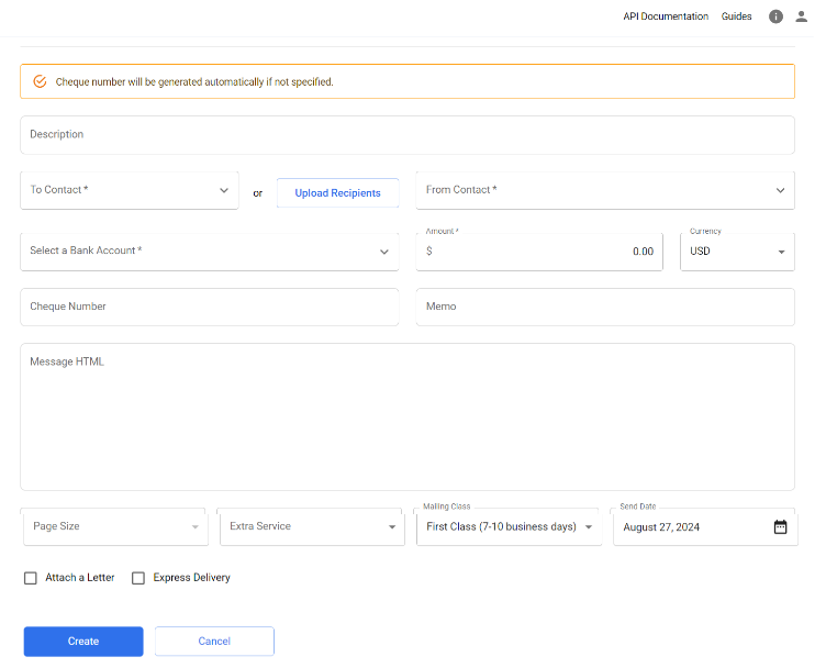- PostGrid’s cheque API lets you create, print, and send cheques all in one place. It is the easiest, safest, fastest, and most affordable method.